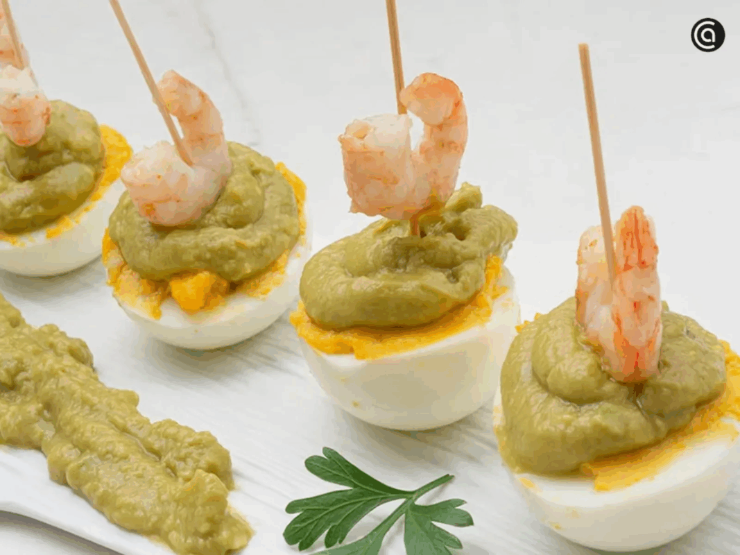El guacamole también puede reinventar la mesa de picoteo. Más allá de los nachos, prueba unos huevos rellenos de guacamole con gambas: vistosos, rápidos de hacer y deliciosos, se convierten en la estrella de cualquier aperitivo.